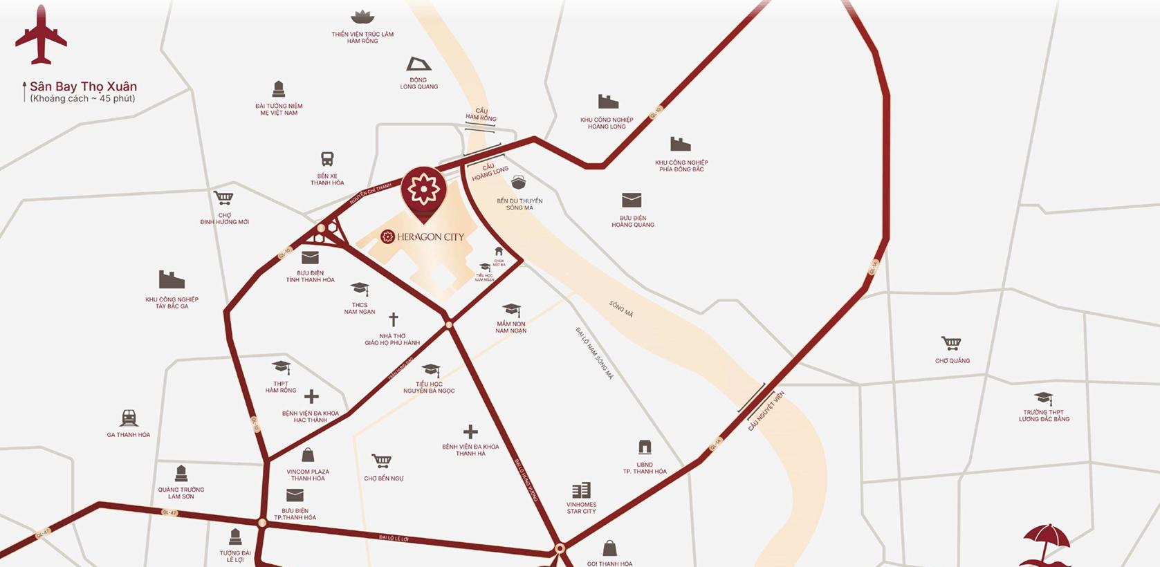 Dự án Heragon City tọa lạc tại phường Nam Ngạn, Hàm Rồng và Đông Thọ của thành phố Thanh Hóa cũ. Dự án tiếp giáp với các trục đường lớn huyết mạch như: đại lộ Hùng Vương, đại lộ Nam Sông Mã, đường Trần Hưng Đạo và đường Nguyễn Chí Thanh. Với vị trí đắc địa cộng với hạ tầng giao thông hiện tại, Heragon City xứng đáng là chốn an cư lý tưởng cho người dân xứ Thanh.